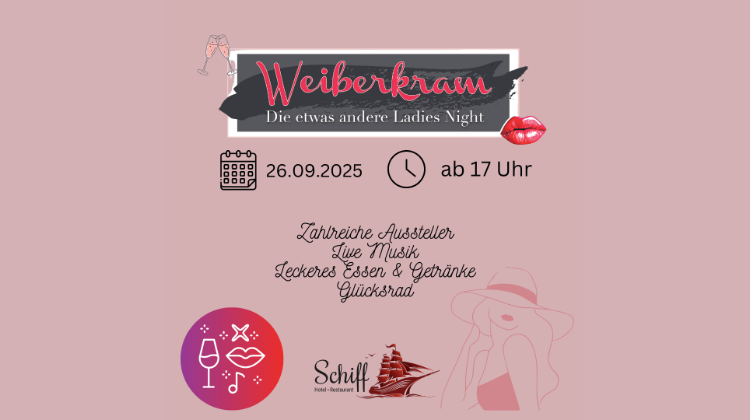 Am Freitag, 26. September 2025, startet bei uns im Hotel Restaurant Schiff ab 17 Uhr die Ladies-Night „Weiberkram“. Ein Abend, der Frauen Freude bringt – mit Livemusik, Beauty-, Schmuck- und Lifestyle-Ständen, leckerem Essen und guter Stimmung. Der Eintritt beträgt 15 €. Ein Begrüßungsgetränk und ein Verzehrbon über 5 € sind inklusive.
